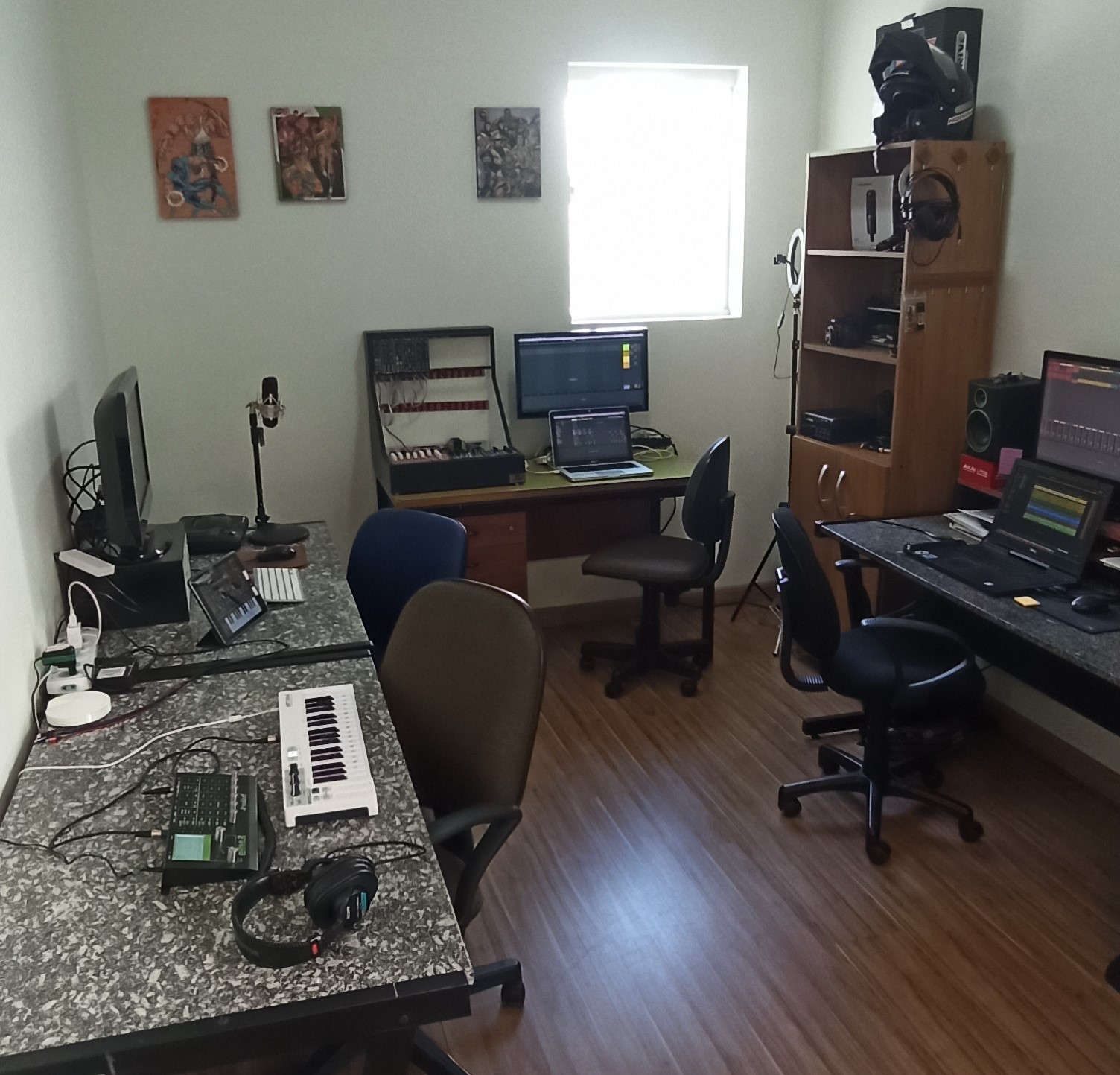 Dois estúdios com tratamento acústico, um estúdio isolado acusticamento, um co-working e um salão isolado com dois ambientes